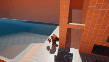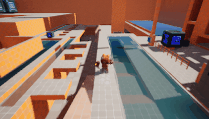 What I did: turned water into a context layer, it slows the mech to warn the player, forces head-only traversal at deeper zones, and pushes players to build paths with props.